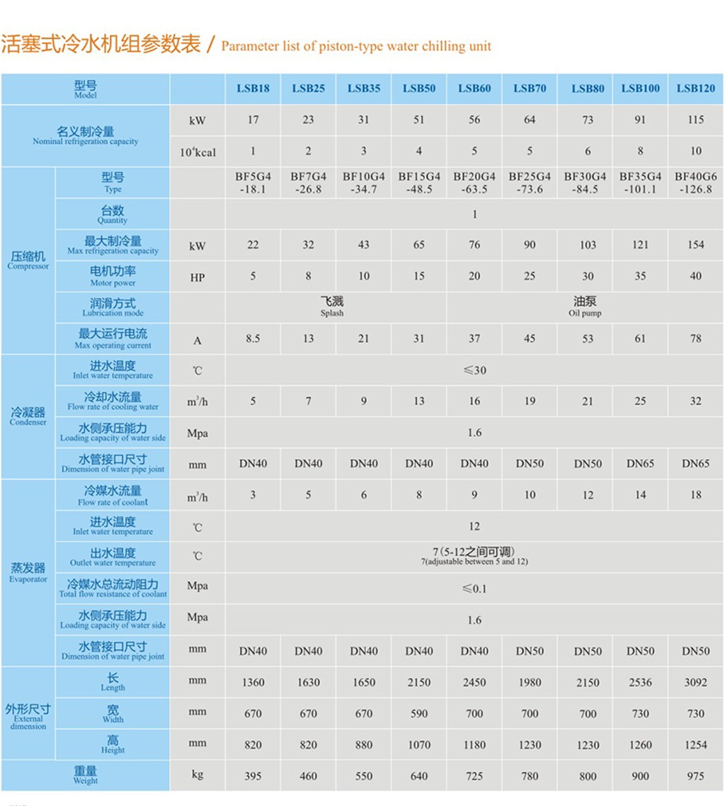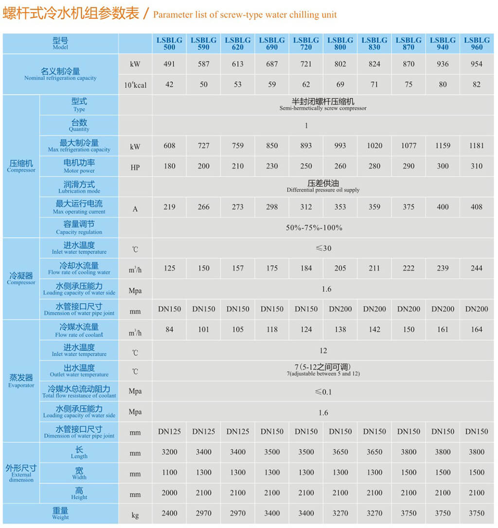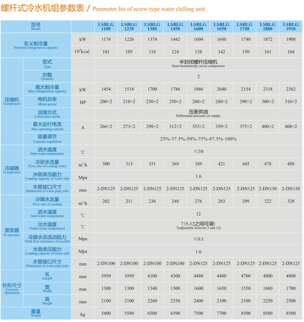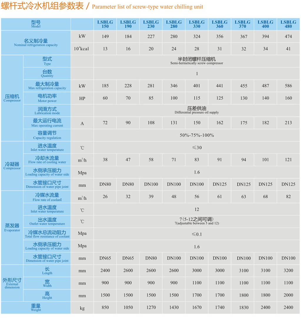 以上數(shù)據(jù)是以R22為制冷劑的機(jī)組性能參數(shù),如需R134a. R407C等其他工質(zhì) ,敬請(qǐng)聯(lián)系,