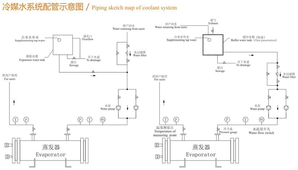 ◆冷媒水系統(tǒng)需安裝膨脹水箱或緩沖罐,應(yīng)用戶不同要求或使用方式,配管方法上有差異,在無(wú)專業(yè)設(shè)計(jì)條件下請(qǐng)與本公